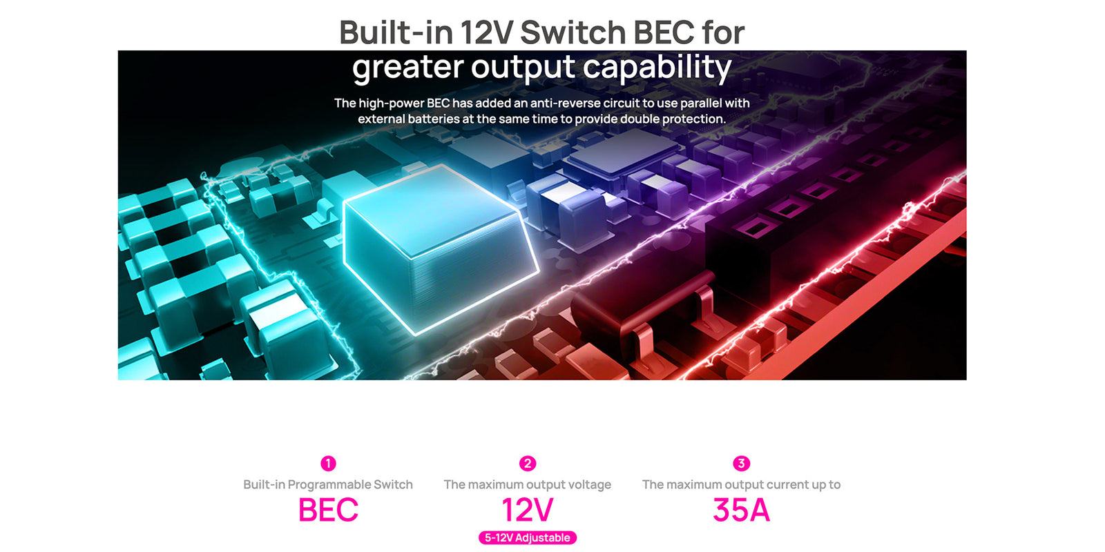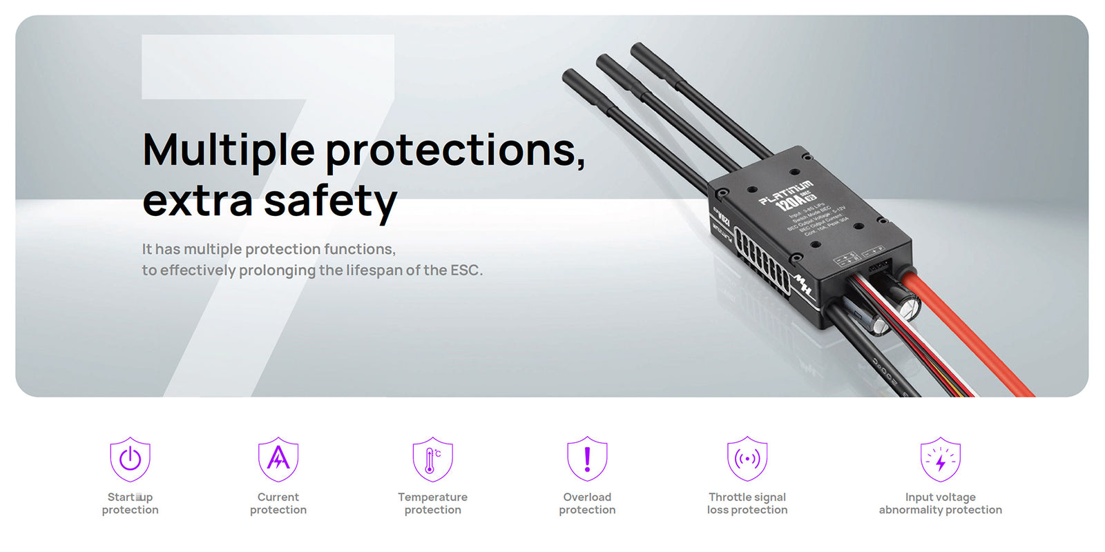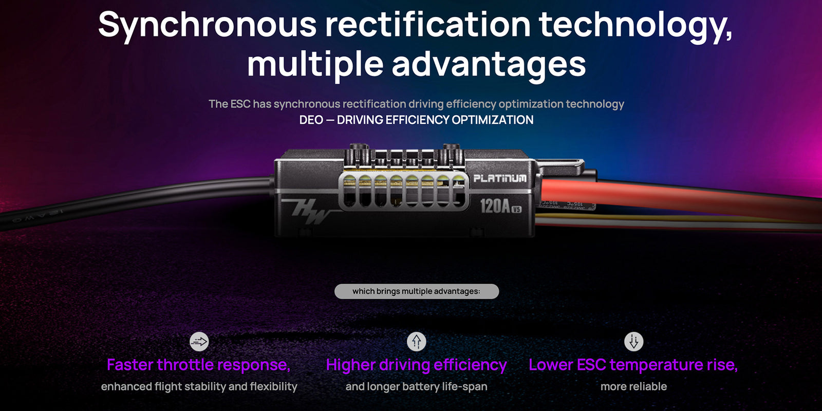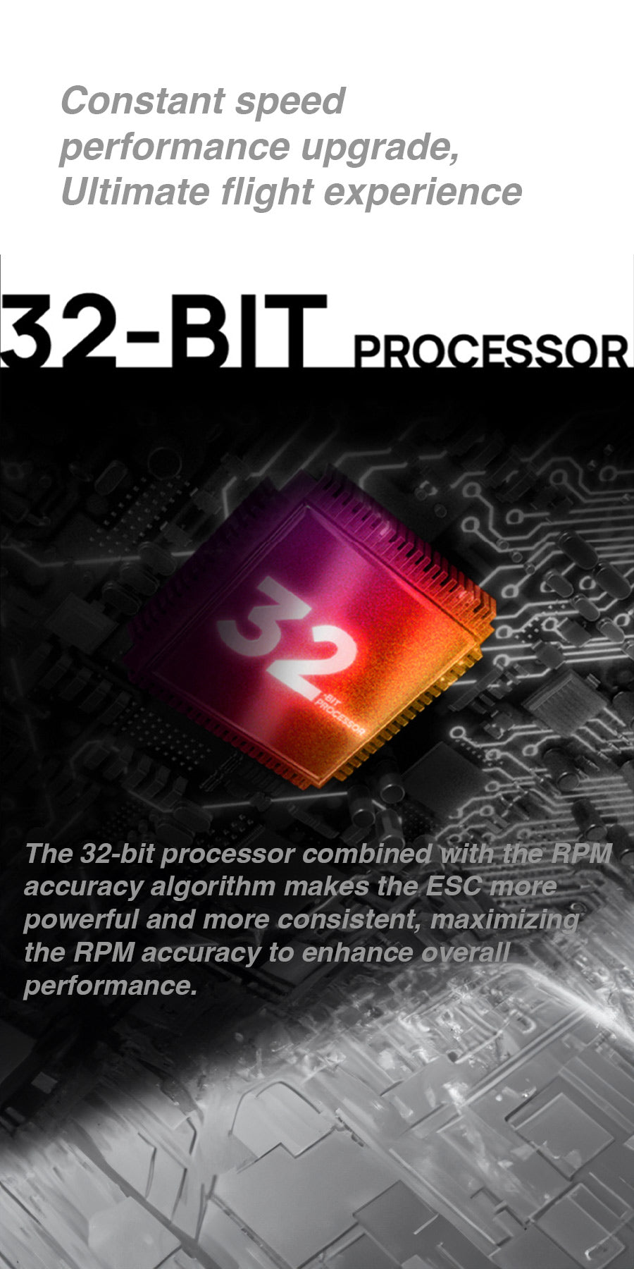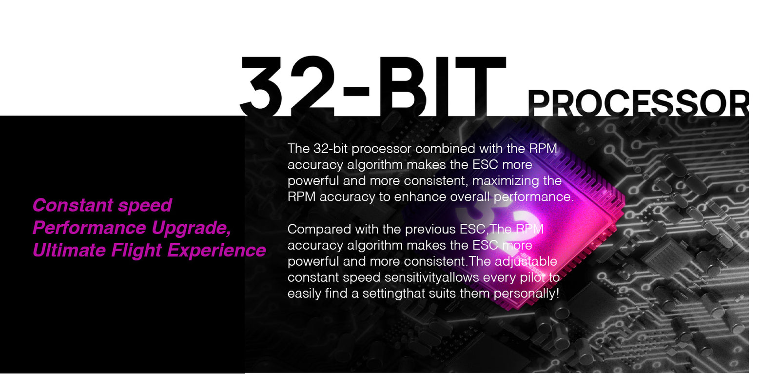 Constant Speed Performance Upgrade, Ultimate Flight Experience; The 32-bit processor combined with the RPM accuracy algorithm makes the ESC more powerful and consistent, maximizing RPM accuracy to enhance overall performance. Compared with the previous ESC, the RPM accuracy algorithm significantly improves power and consistency. The adjustable constant speed sensitivity allows every pilot to easily find a setting that suits their flying style.