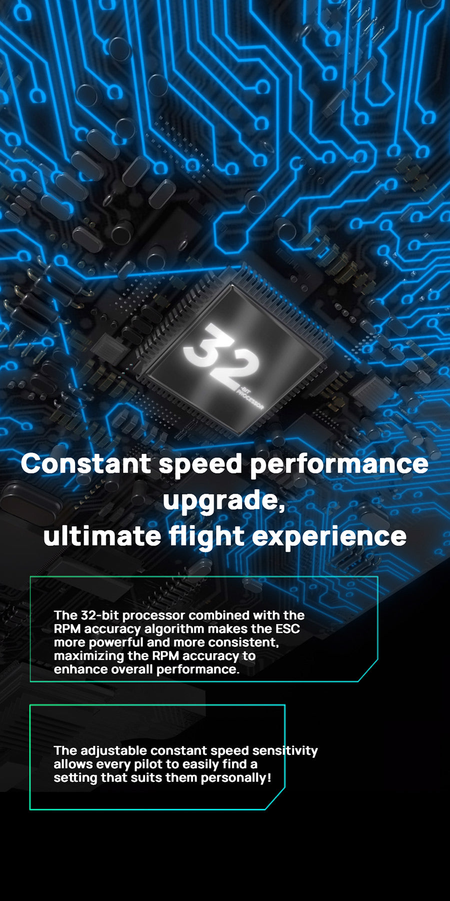 Constant Speed Performance Upgrade, Ultimate Flight Experience; The 32-bit processor combined with the RPM accuracy algorithm makes the ESC more powerful and consistent, maximizing RPM accuracy to enhance overall performance. Compared with the previous ESC, the RPM accuracy algorithm significantly improves power and consistency. The adjustable constant speed sensitivity allows every pilot to easily find a setting that suits their flying style.