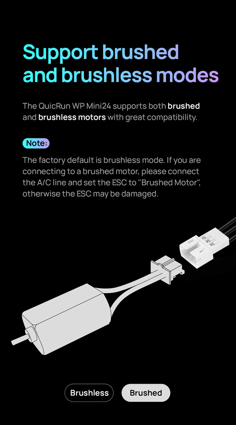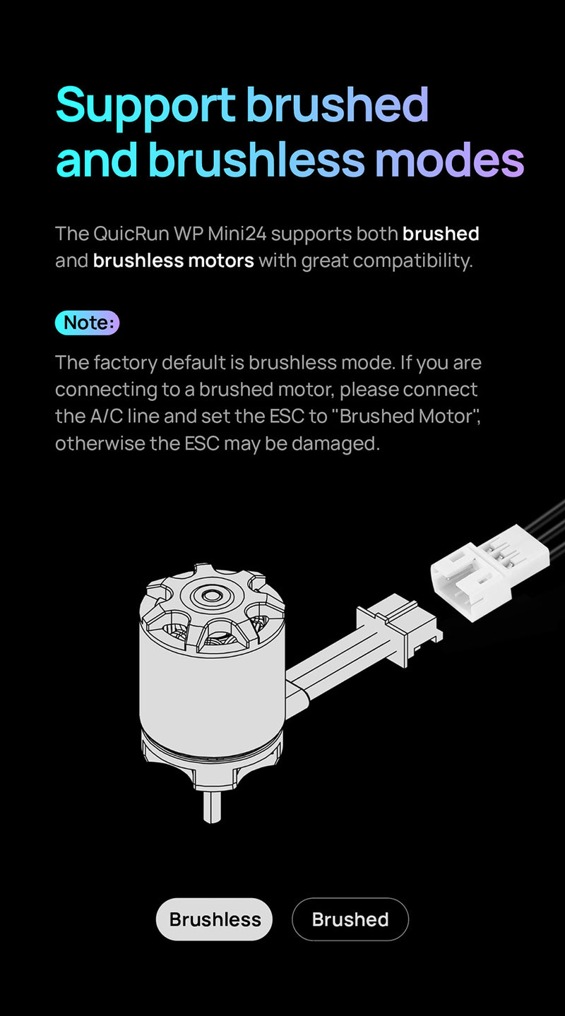 The QuicRun WP mini24 ESC supports sensorless brushless motors and brushed motors, making it compatible with most motors on the market. Its fully waterproof design ensures reliable performance in all conditions.