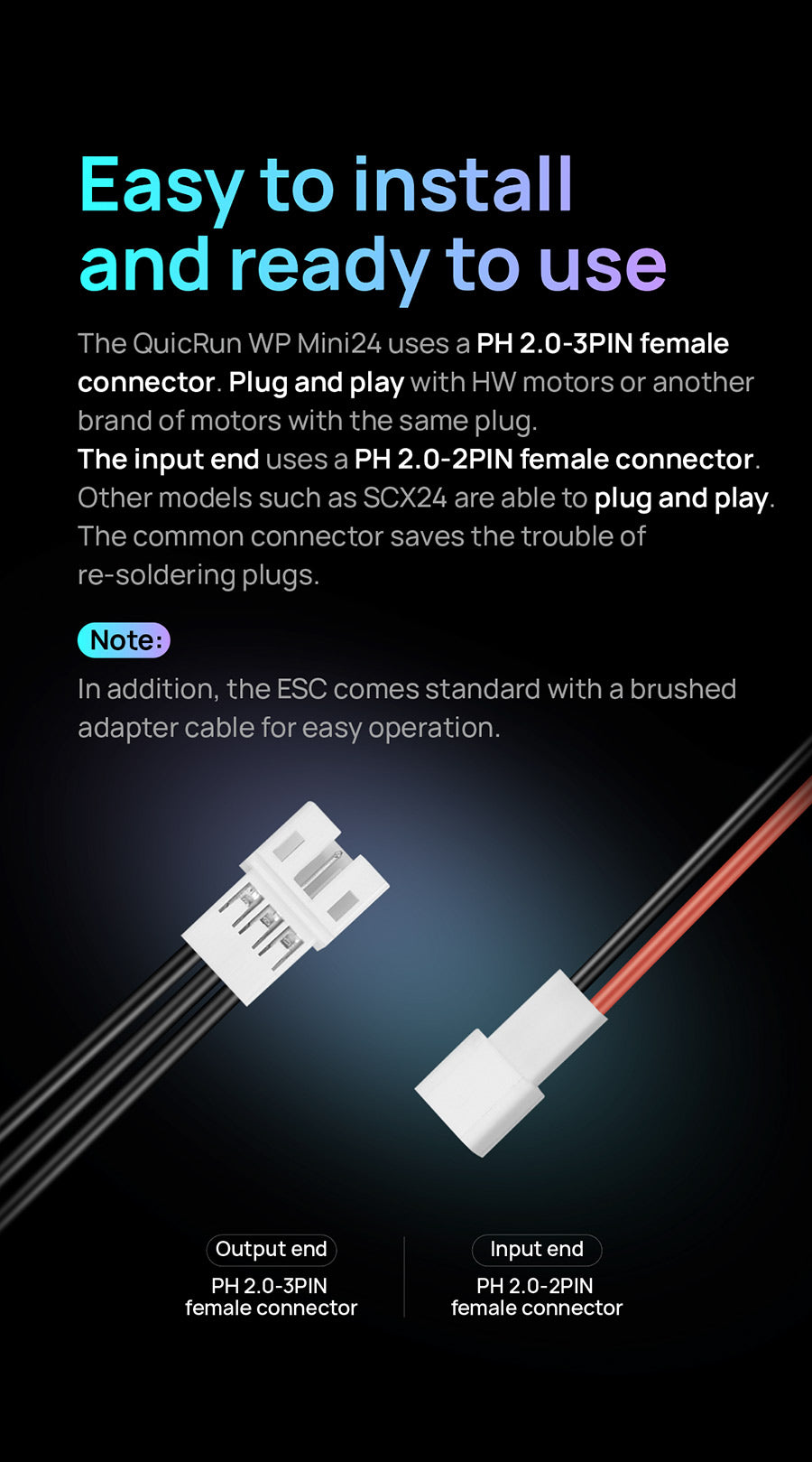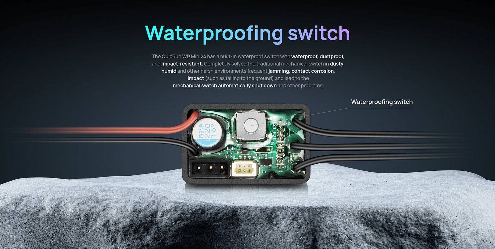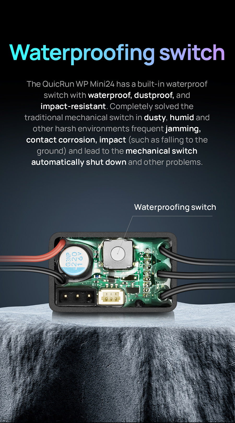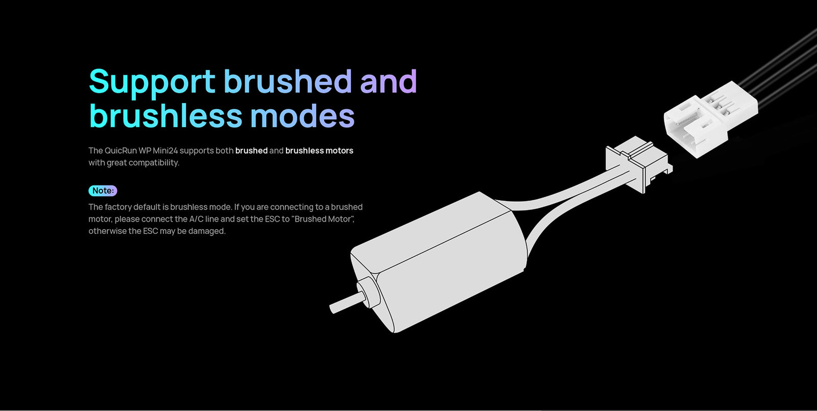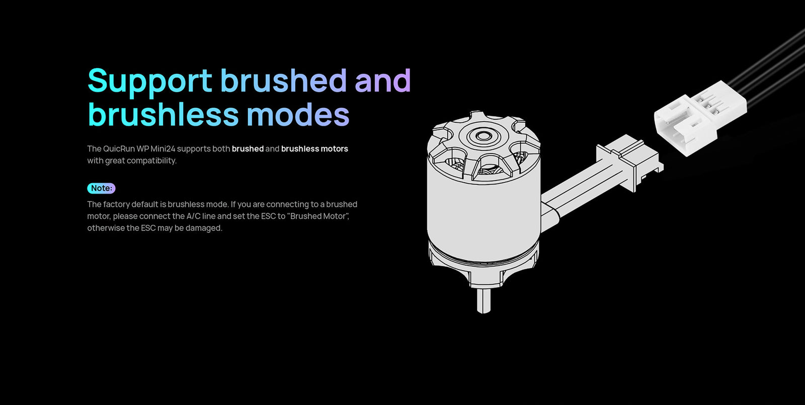 The QuicRun WP mini24 ESC supports sensorless brushless motors and brushed motors, making it compatible with most motors on the market. Its fully waterproof design ensures reliable performance in all conditions.