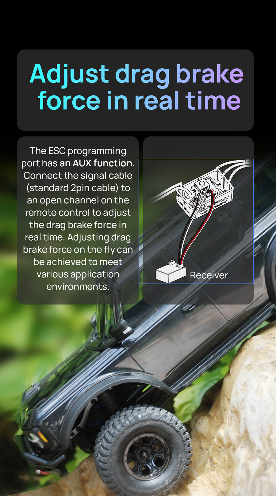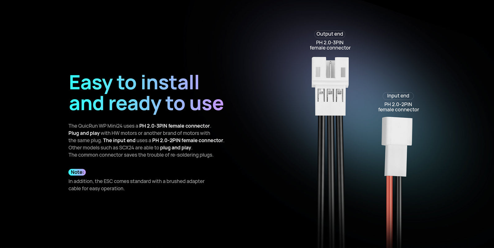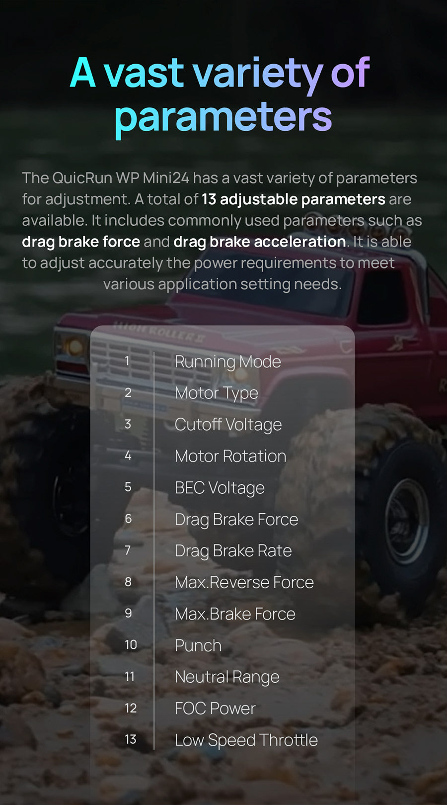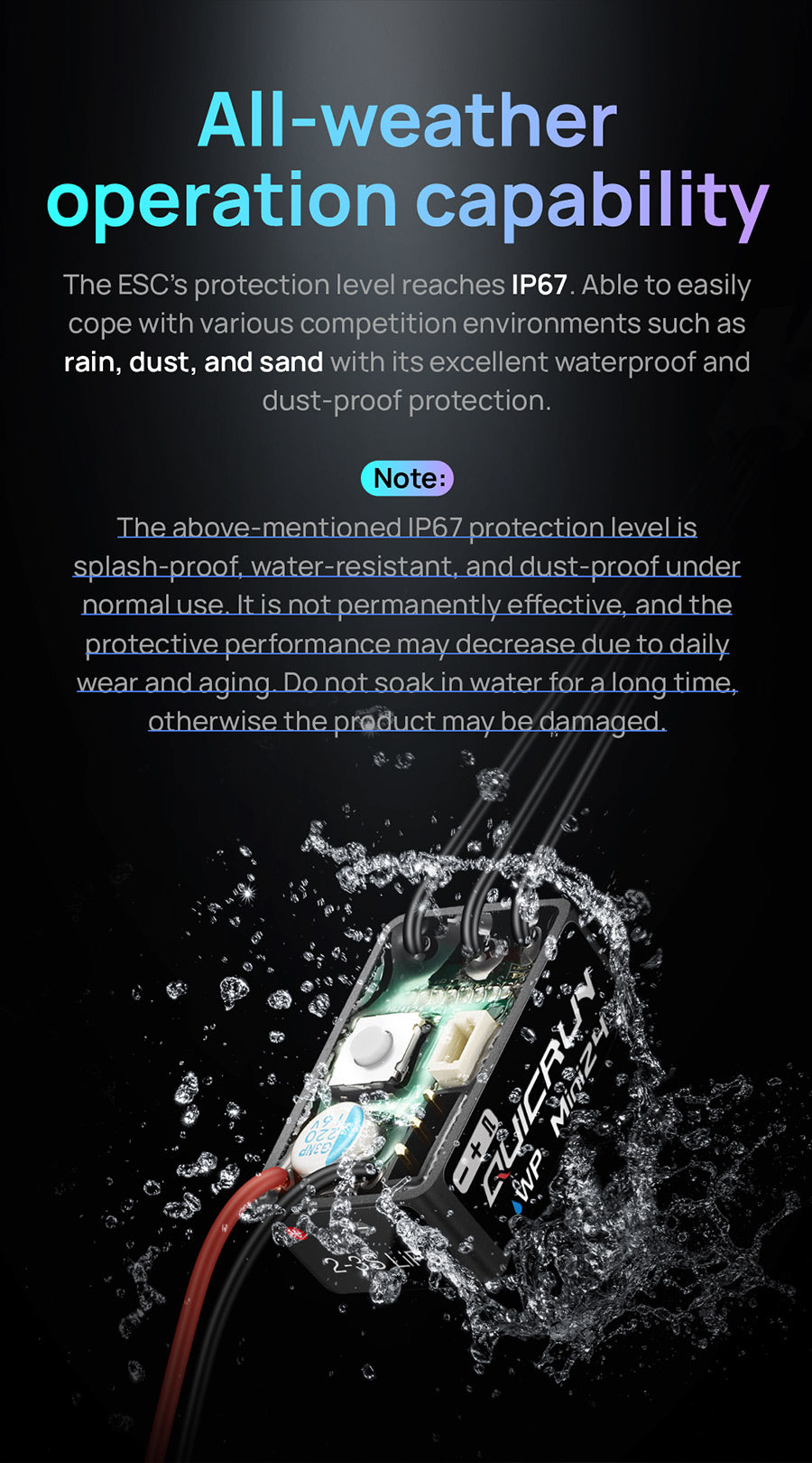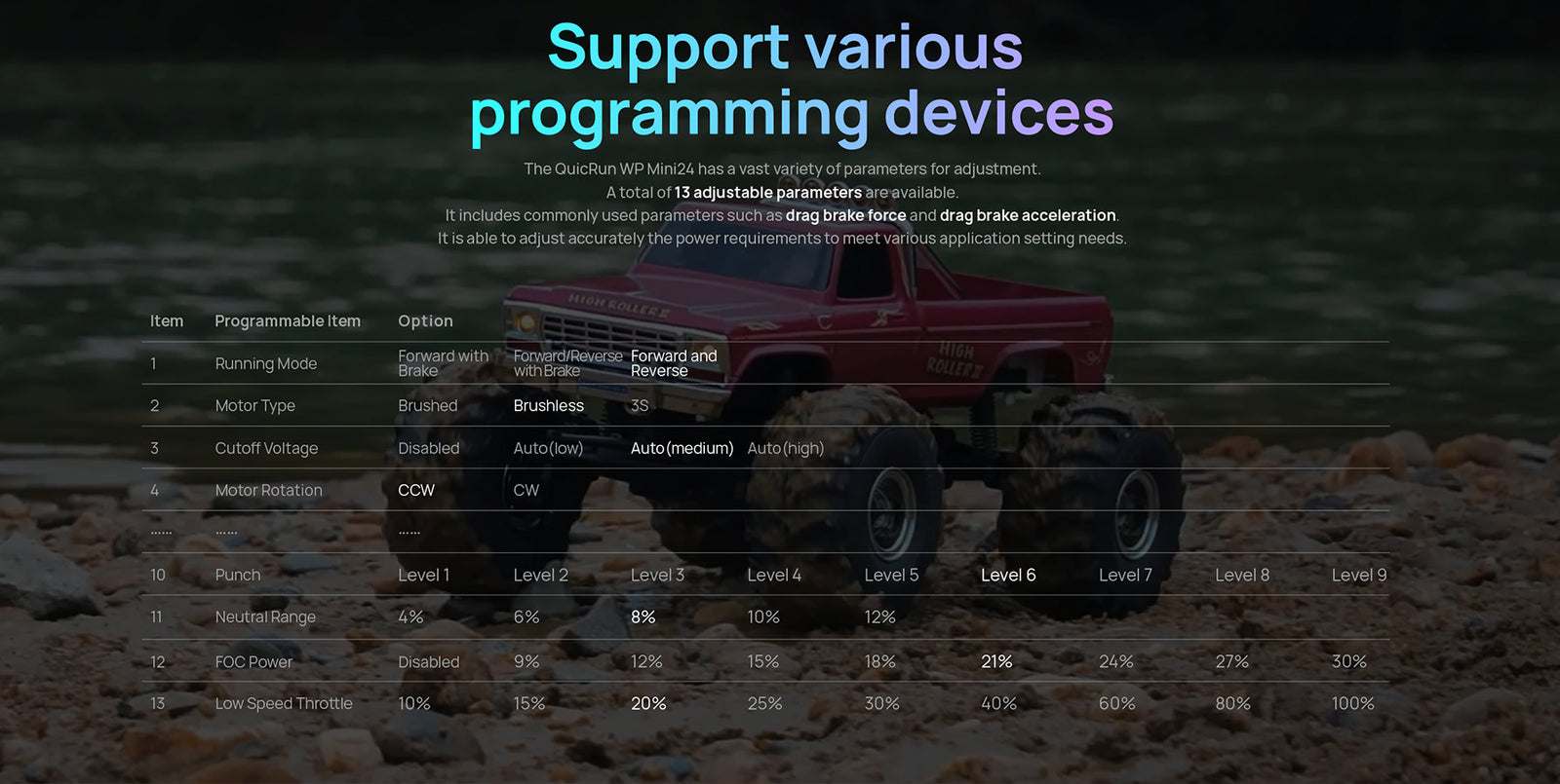 The QuicRun WP mini24 ESC supports sensorless brushless motors and brushed motors, making it compatible with most motors on the market. Its fully waterproof design ensures reliable performance in all conditions.