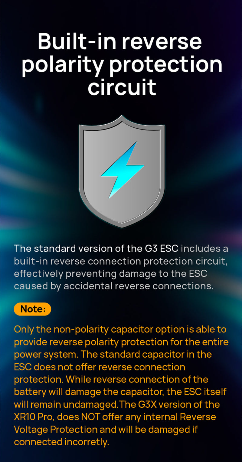 Battery Connection: Proper polarity is essential. Please ensure that positive (+) connects to positive (+) and negative (-) connects to negative (-) when plugging in the battery! The XR10 PRO G3 ESC is equipped with Hobbywing’s patented technology, Reverse Polarity Protection (RPP). In the event of mistakenly connecting the power wire backward, while conventional external capacitor packs may be damaged, the revised connection will not harm the ESC.
